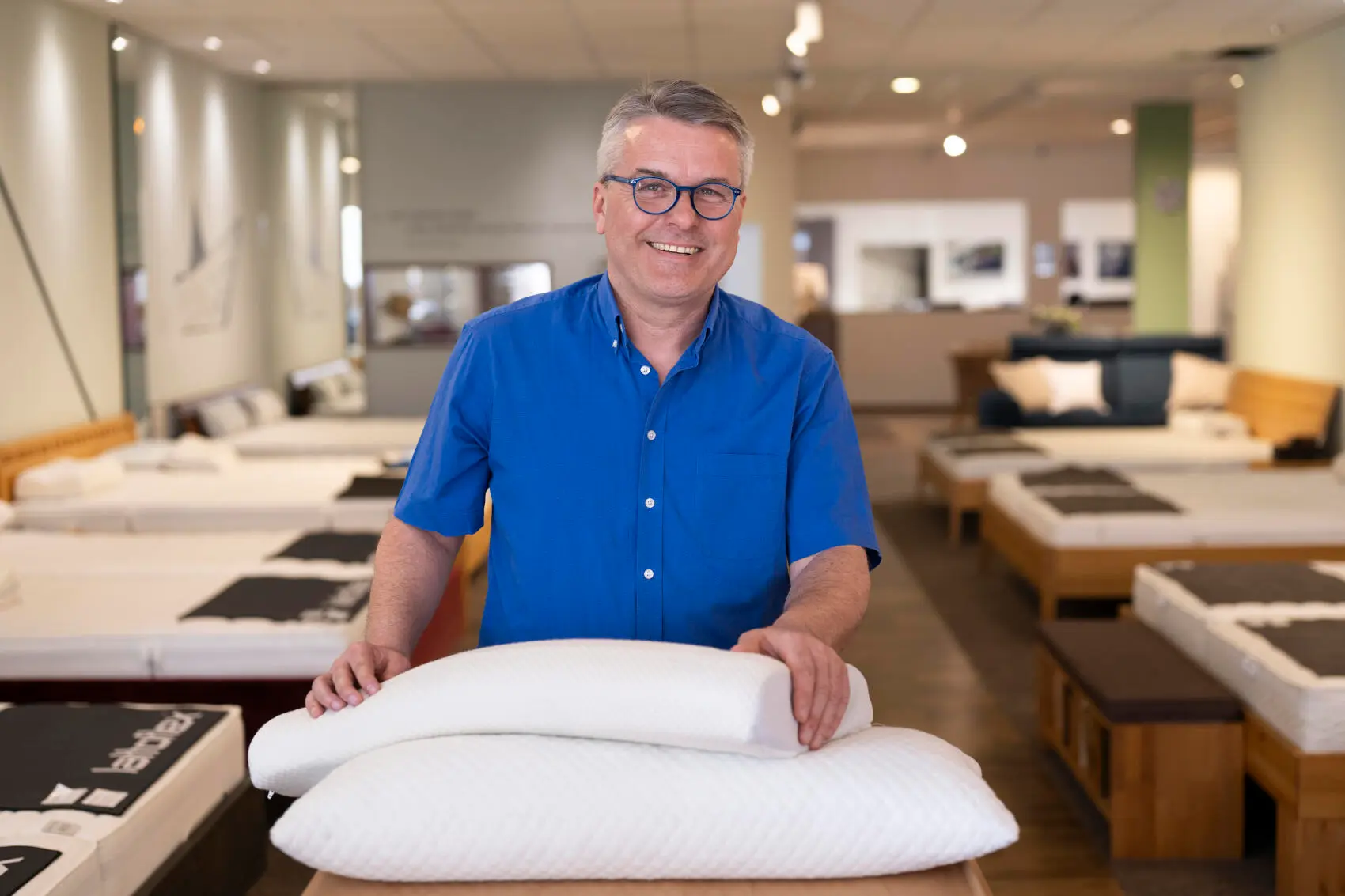 Unsere Nackenstützkissen sind perfekt für Rückenschläfer und Seitenschläfer. Sie fördern eine entspannte Lagerung durch gezielte Stützung im Halsbereich, ohne einseitiges oder falsches Abknicken zu erzwingen. Mit unserem Messsystem können wir die für Sie optimale Höhe und Festigkeit ermitteln, maßgeschneidert und abgestimmt auf Schulterbreite, Kopfbreite und Matratzenhärte. Verschiedene Kissentypen in unserer Ausstellung von kuschelig bis fest lassen uns die Möglichkeit das für Sie richtige Kissen zu ermitteln.