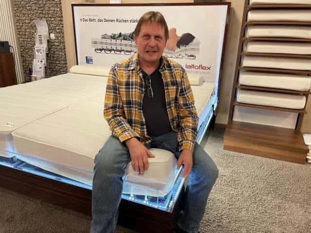 Während der Beratung wurden meine Frau und ich mit dem Messsystem vermessen und haben mehrere Matratzen ausprobiert. Ich habe mich für das Lattoflex Bettsystem mit den Tellerflügeln entschieden, da es aktuell das innovativste Bettsystem ist und eine sehr lange Lebensdauer bietet.