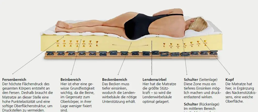 Tipp: mit einem angemessenen Lattenrost und einem individuell angepassten Nackenkissen, können Sie die Wirkung der Matratze noch weiter verbessern, um die Schulter noch besser zu entlasten oder den Lendenbereich bei Bedarf noch stärker zu stützen.